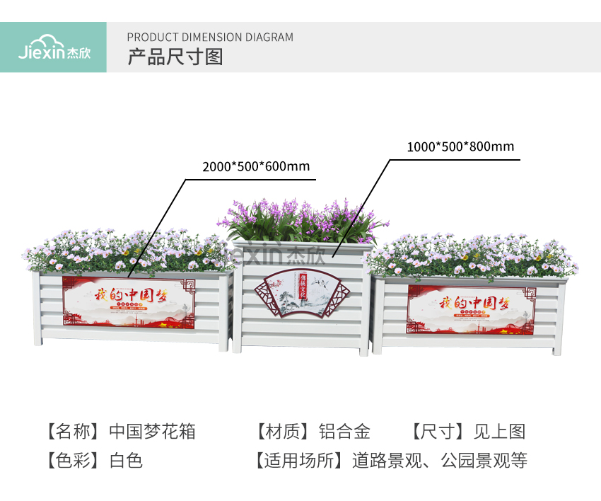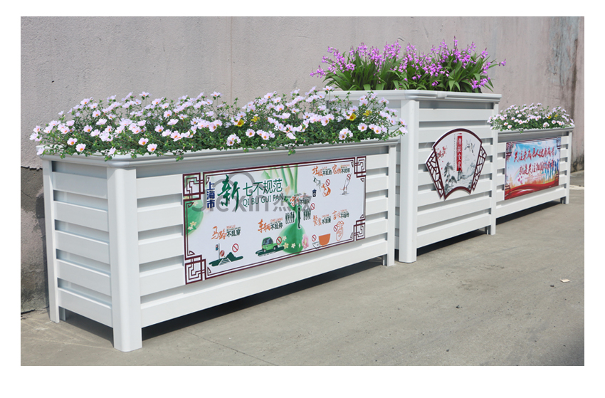 白色鋁合金花箱在道路中非常常見。而不多見的是主題花箱。