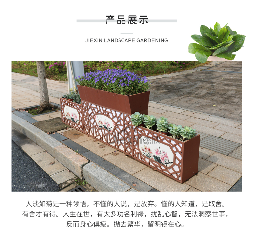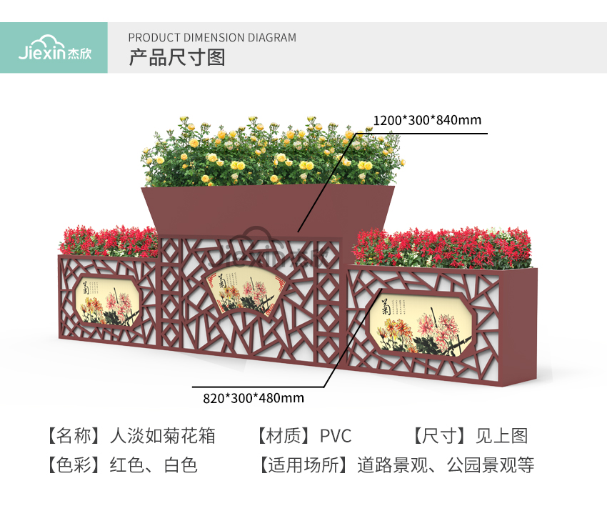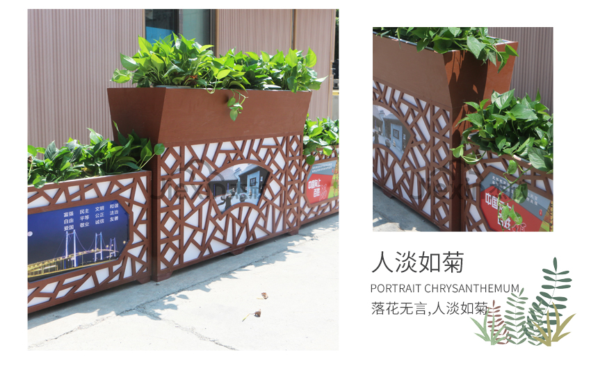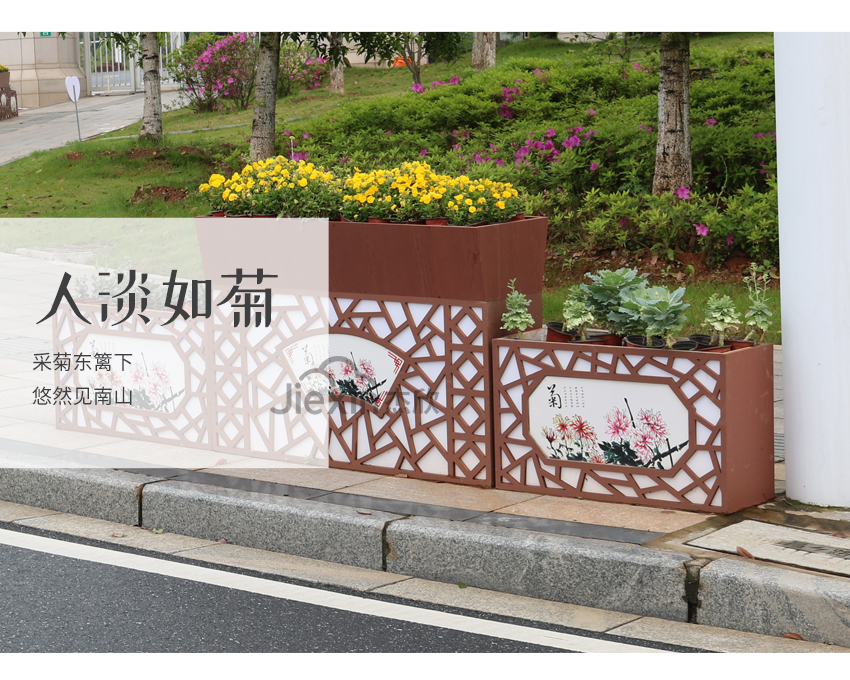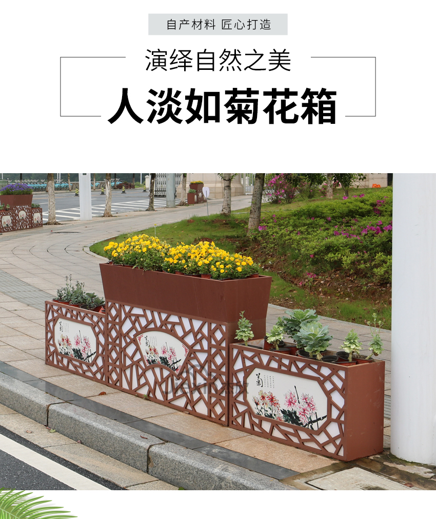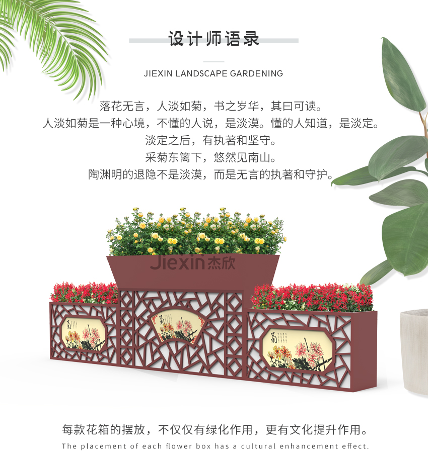 組合花箱的樣式往往較少,而這款花箱則將菊文化融入其中,展現(xiàn)出組合花箱不同的一面。