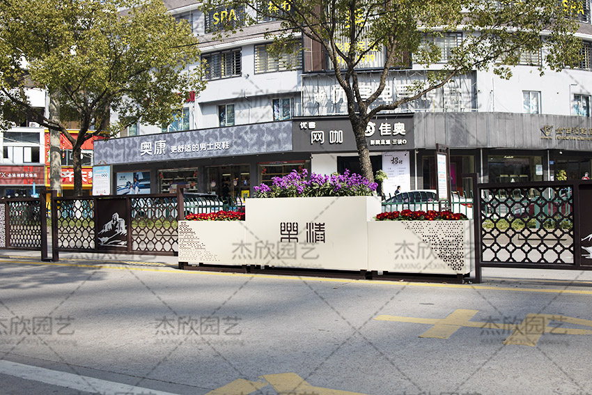 這款不銹鋼板花箱,取自在時代洪流中書寫中國特色風(fēng)采之意?;ㄏ湎潴w和街景形成反差,表現(xiàn)出靚麗的風(fēng)景。仿古的護(hù)欄展現(xiàn)出文化的積淀與傳承,描繪出時代的新貌。