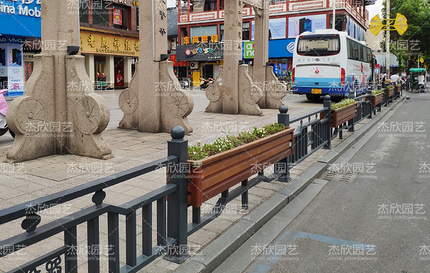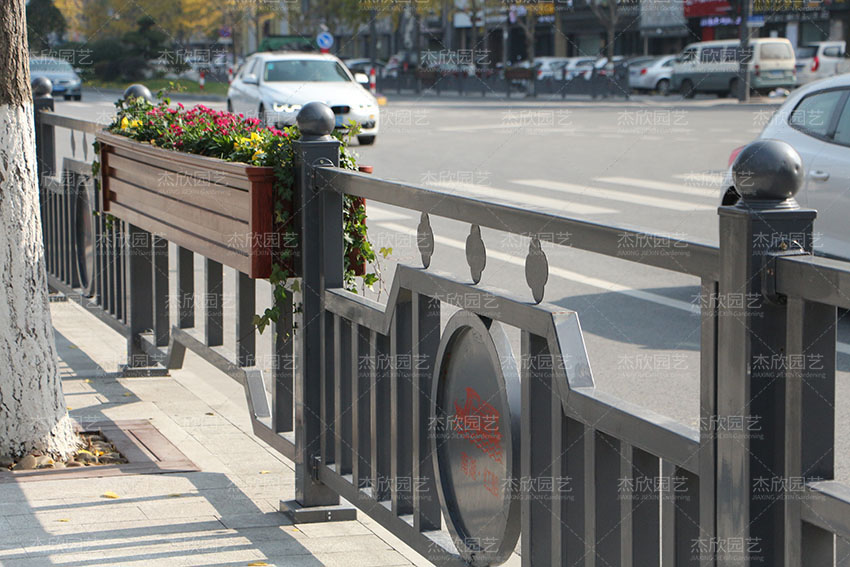 人行道隔離帶花箱,空間比較狹窄,多采用懸掛型花箱護(hù)欄。