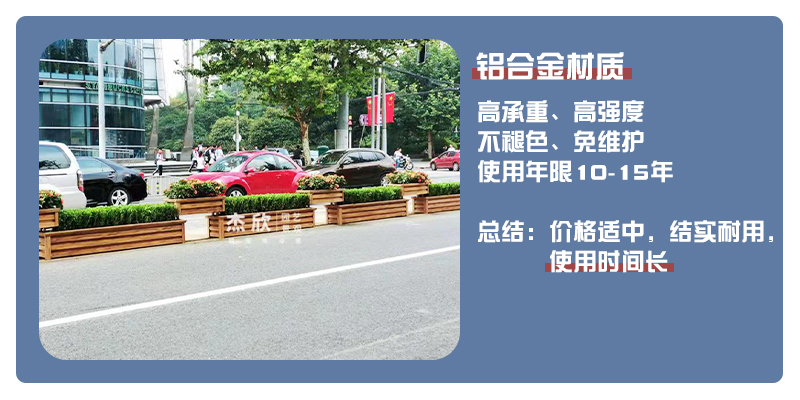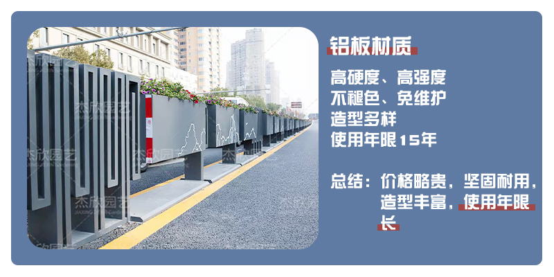 Pvc花箱、鋁合金花箱、鋁板花箱都是常見的花箱材質(zhì),隔離帶花箱更推薦鋁合金花箱、鋁板花箱,使用年限更長(zhǎng)、更耐用。