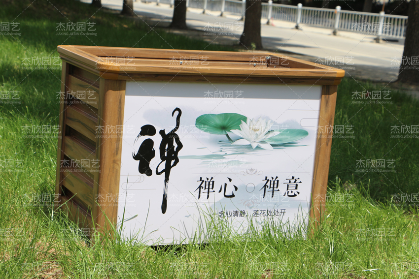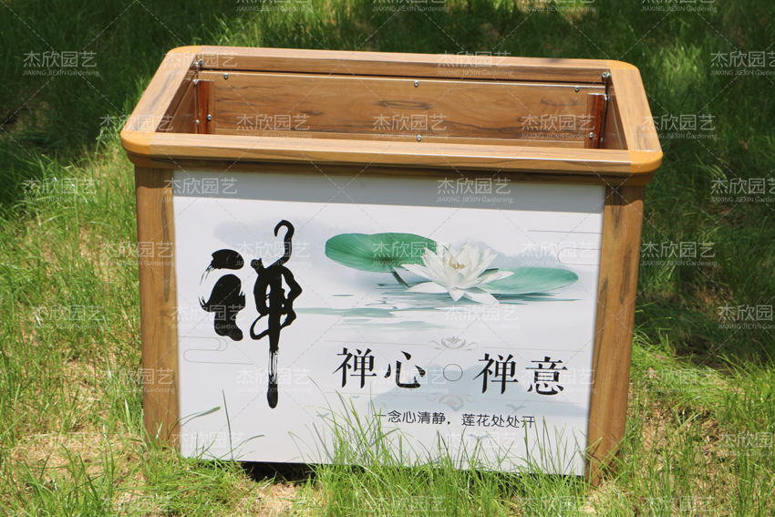 比如說這款,就是禪意文化定制花箱。黃檀木色的花箱與禪意貼畫融合,展現(xiàn)出自然、休閑、灑脫的人文追求?;ㄏ涠ㄖ苹ㄏ?,盡可能地滿足了定制的需要,增添了花箱的美觀度,擴大了花箱的使用場景。