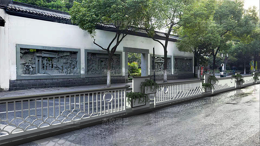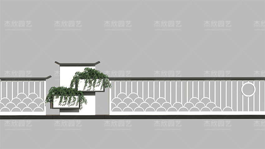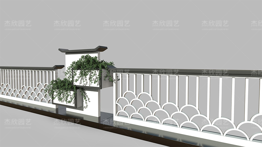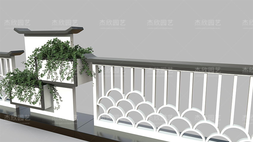 護(hù)欄部分加以魚紋、波紋,表現(xiàn)祥瑞之意,也豐富了花箱的整體造型,傳達(dá)出清淡雅素又不失美感的傳統(tǒng)藝術(shù)。